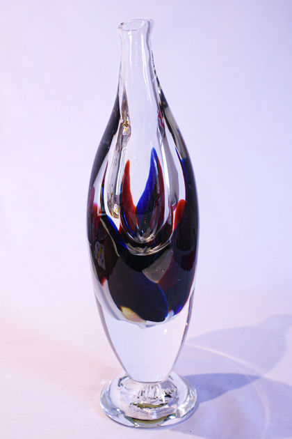 My goal with these vessels was to develop the long-necked teardrop bottle form while testing application methods and designs with the patchwork patterns. These objects also highlight the reflective qualities of the interior bubble when the glass is kept thick.